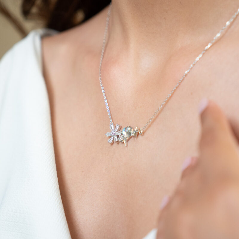 Infuse your style with natureās artistry through the Petal Bloom Pendant & Earring Set. Designed with hand-painted enamel petals in graceful shades of violet or teal green, this set captures the delicate beauty of a blossoming flower within a warm rose gold oval frame. The necklace features a unique split-chain design with dainty faux pearls and a sleek rose gold link chain for added sophistication.